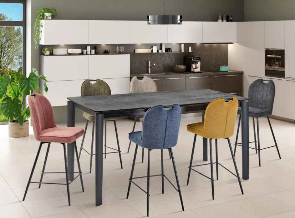 • TABLE HAUTE DE REPAS TIMEO CERAMIQUE GRIS NUANCE 140/190x90x90cm